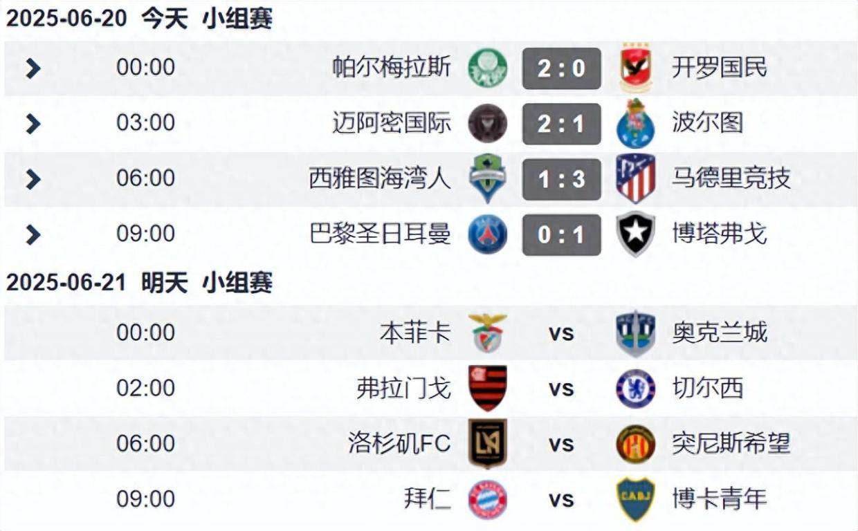 2025世俱杯来到了第6个比赛日,A组和B组第二轮的4场比赛战罢,爆出了一个超级大冷门,欧冠冠军巴黎输球了,马竞赢球但面临出局危机,梅西世界波带领迈阿密国际重燃晋级希望。