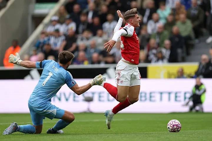 比赛的第一个重大争议出现在上半场。阿森纳前锋维克托·焦克雷斯在突入禁区后与纽卡斯尔门将尼克·波普相撞,主裁判贾里德·吉莱特当即判罚点球。然而,在VAR达伦·英格兰介入并提示其回看后,吉莱特推翻了自己的决定,理由是波普“先触到皮球,不构成犯规”。